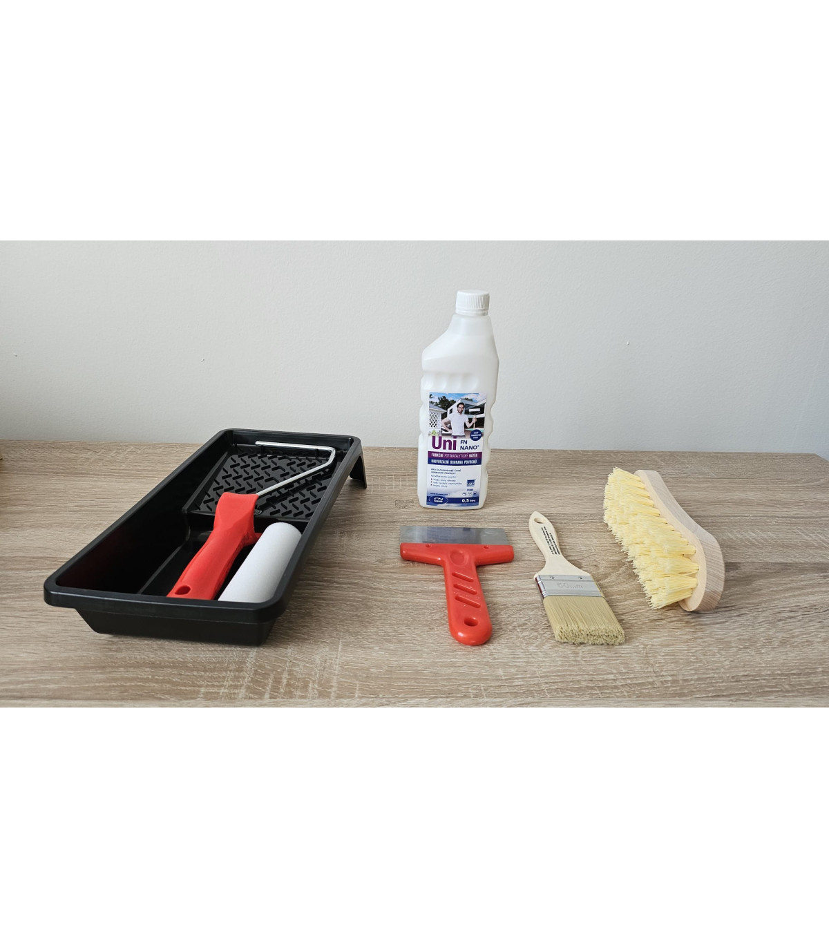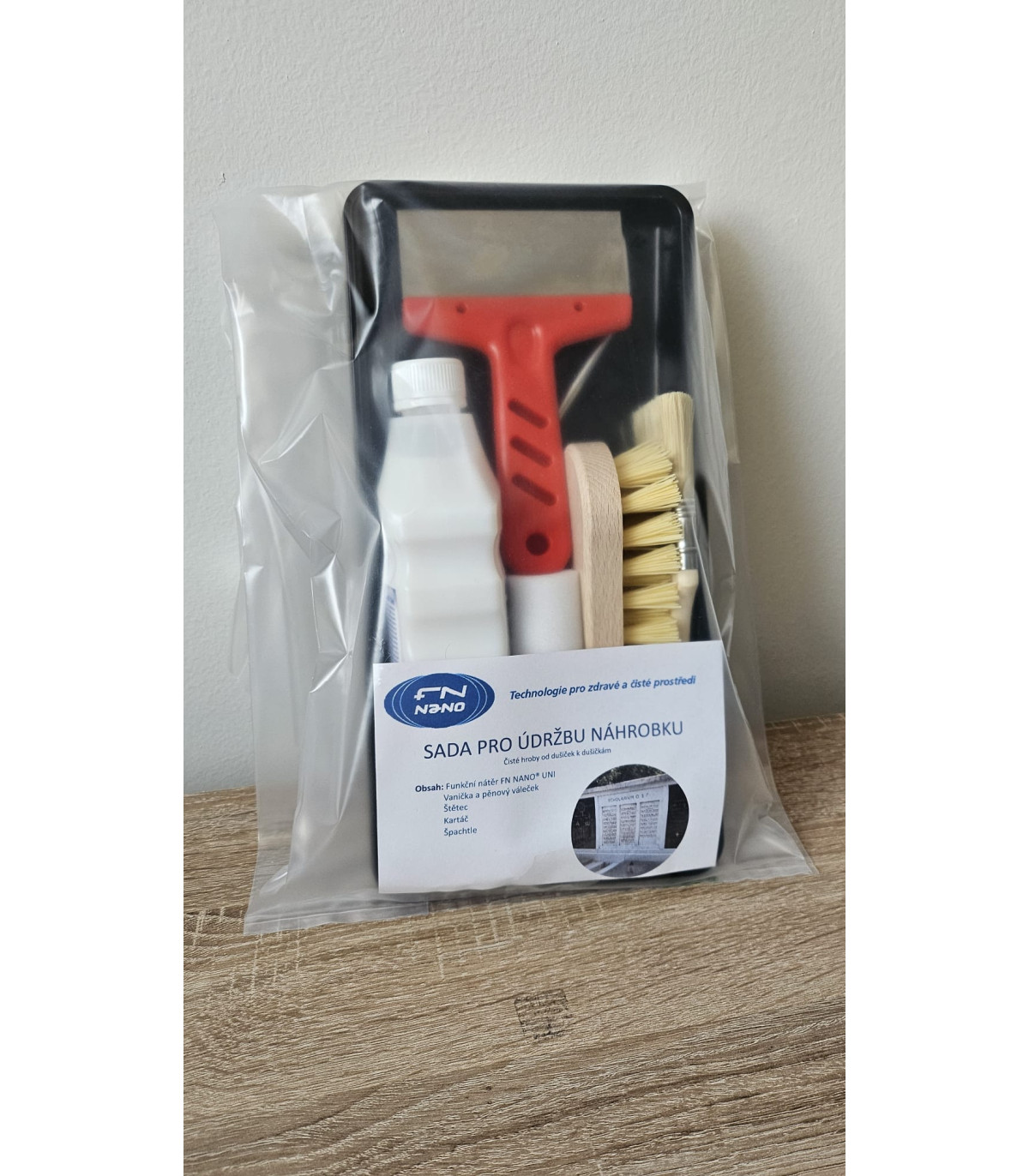 Súprava na ochranu kamenných povrchov obsahuje všetko, čo je potrebné na mechanické odstránenie nečistôt a následné ošetrenie povrchu samočistiacim náterom FN NANO® Uni. Súprava je určená na špinavý povrch a po nanesení náteru FN NANO® Uni vznikne šedobiela patina na povrchu. Povrch sa bude postupne fotokatalytickým efektom čistiť a patina časom zmizne. Po vyčistení zostane povrch dlhodobo čistý.
